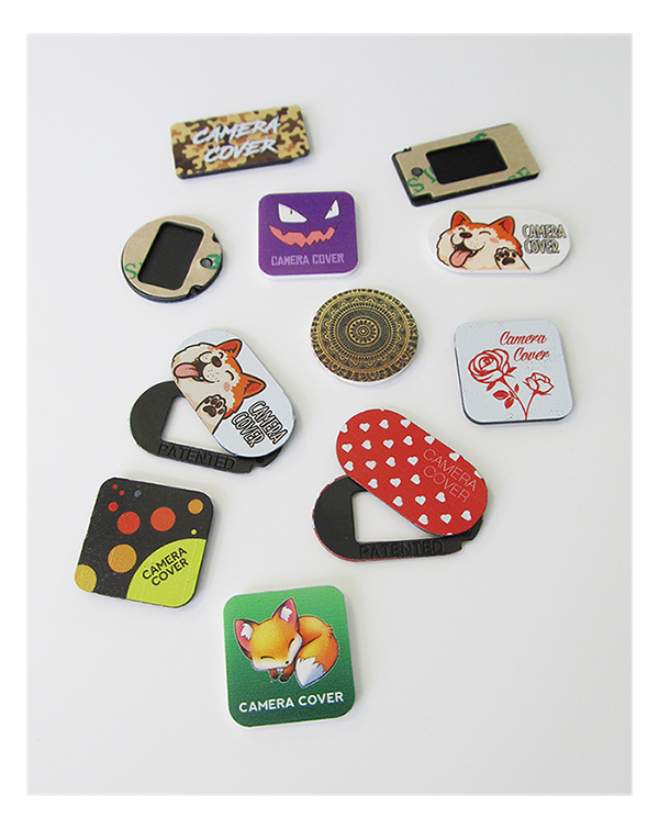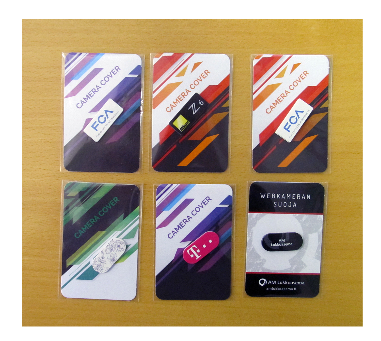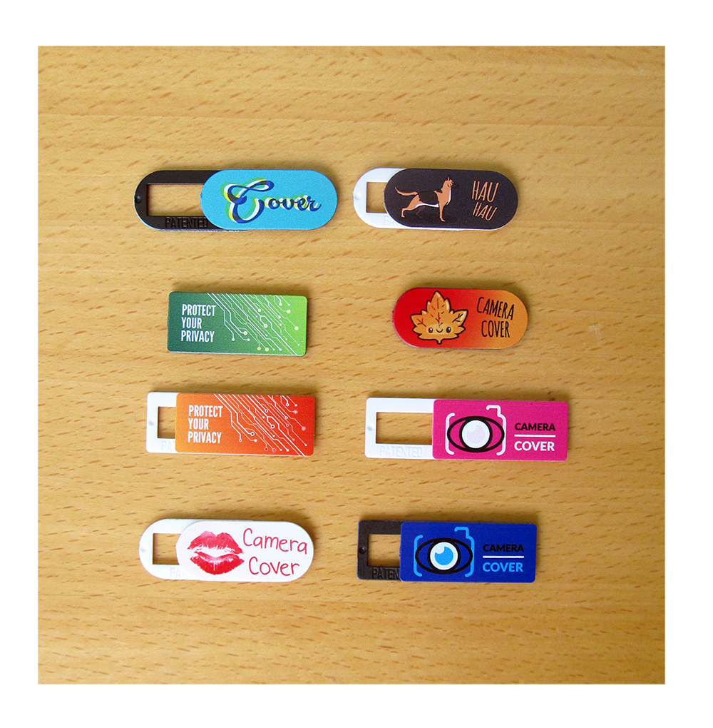 Bloker kamerki internetowej, wersje uchylne lub przesuwne, prostokąt, kwadrat, krążek, klej nie zostawiający śladów, wymiary 30 x 13 mm - laptop, oraz 17 x 8 / 25 x 10 mm - smartfon, nadruk w pełnym kolorze, cena dla 1000 szt. Pakowane w woreczek z kartonikiem - nadruk w pełnym kolorze.
