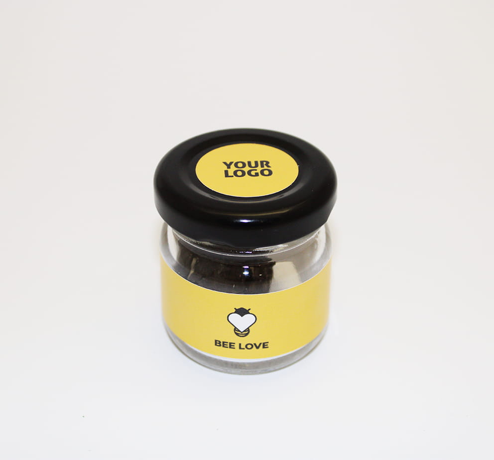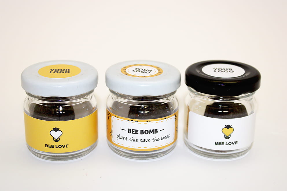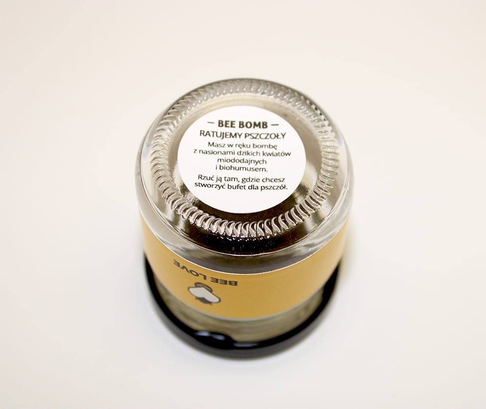 Bomba nasienna reklamowa, słoik 5 cm, cena dla min. 100 szt.m, ciekawy gadżet reklamowy, znakowanie- etykiety w pełnym kolorze, wewn. biohumus, glina, nasiona kwiatów polnych