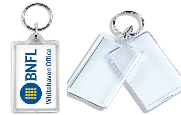 Brelok akrylowy, 63 x 37 mm, wkładka z obustronnym nadrukiem, cena dla 100 szt.