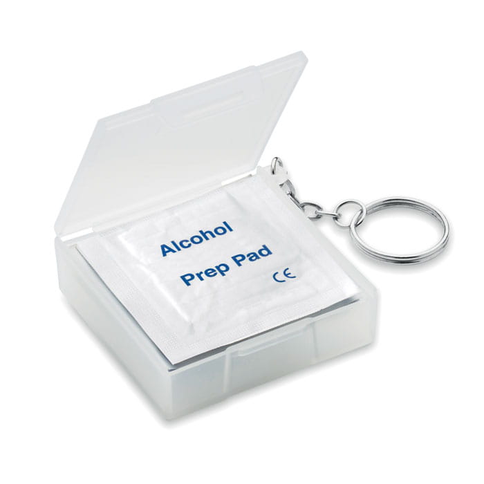 Brelok z chusteczkami dezynfekującymi, 10 chusteczek z alkoholem 70% o wym. 30 x 65 mm, pudełko PP, ciekawy gadżet reklamowy, znakowanie - nadruk