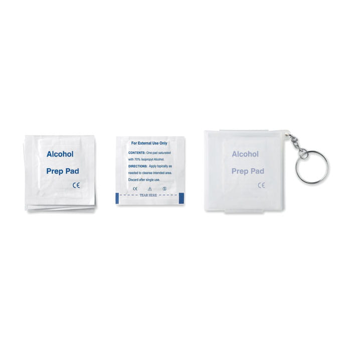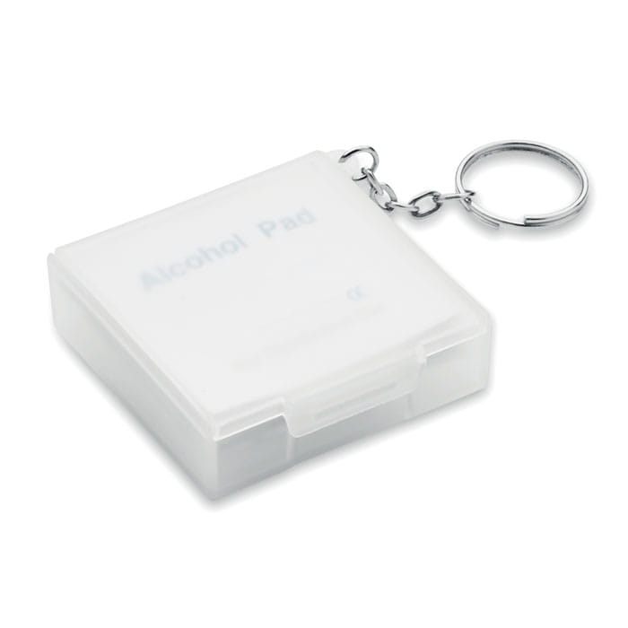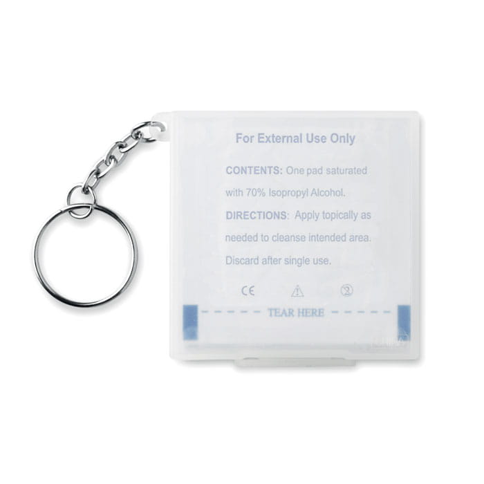 Brelok z chusteczkami dezynfekującymi, 10 chusteczek z alkoholem 70% o wym. 30 x 65 mm, pudełko PP, ciekawy gadżet reklamowy, znakowanie - nadruk