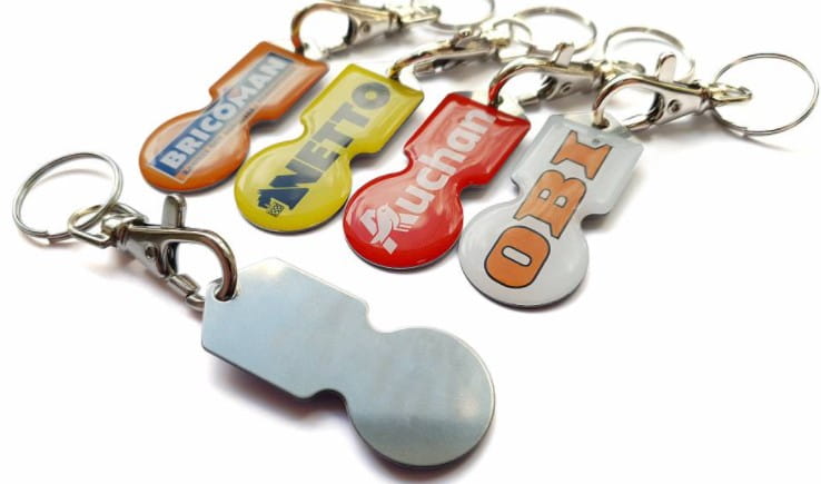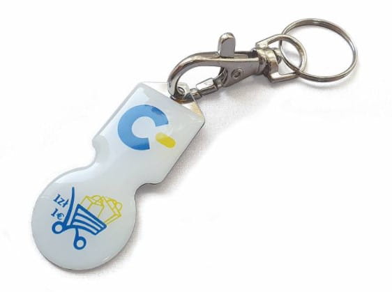 Brelok z żetonem - doming, połączenie stali nierdzewnej z naklejką żywiczną, cena dla 1000 szt. (min. - 100 szt.), ciekawy gadżet reklamowy, dowolny druk