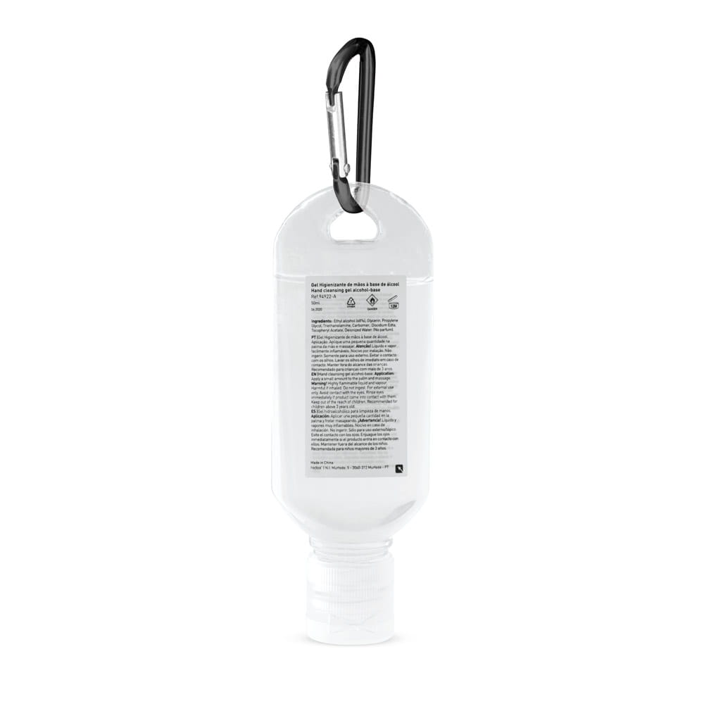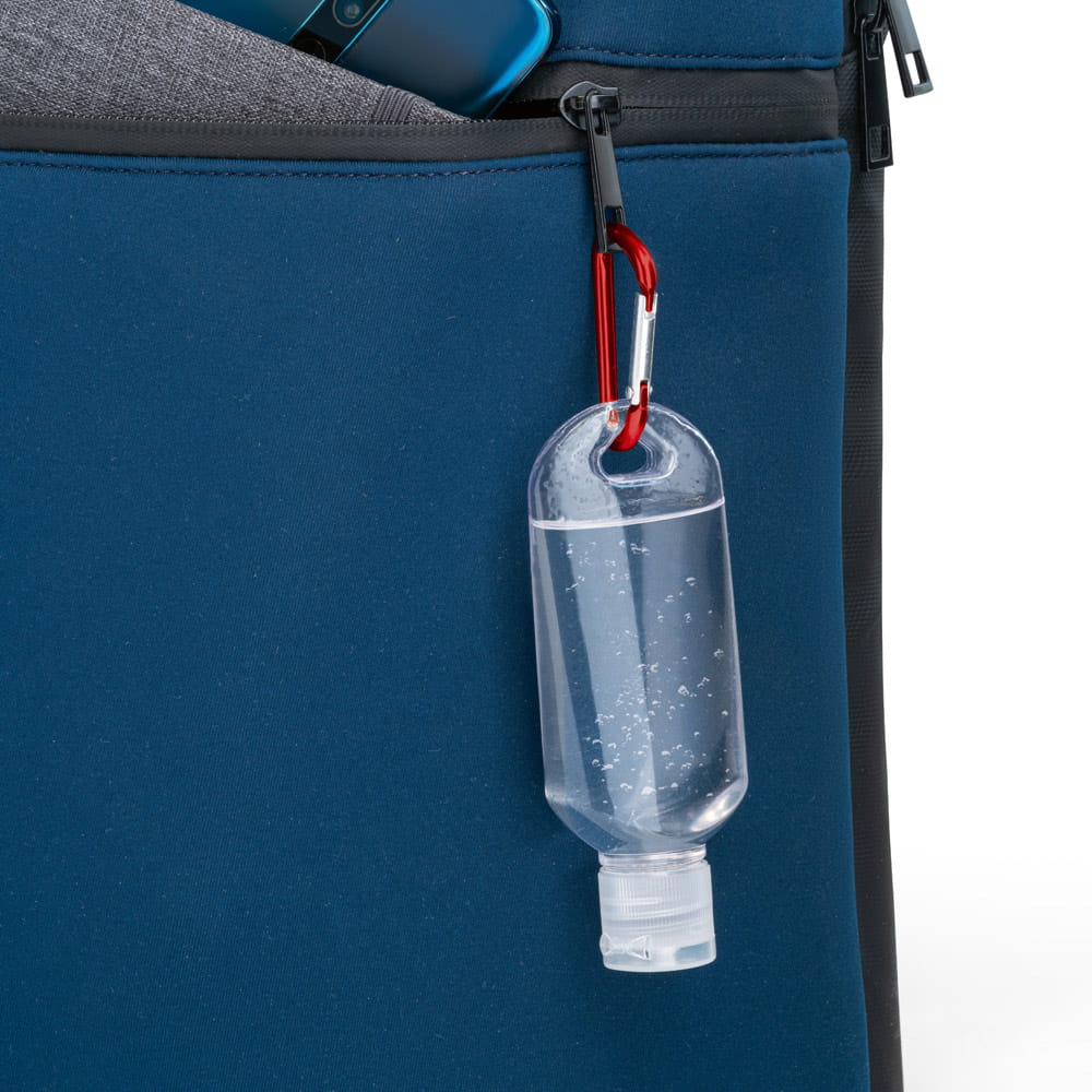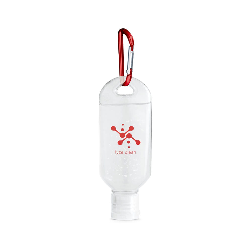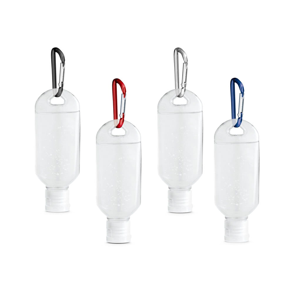 Buteleczka z żelem i karabińczykiem, 50 ml, 45 x 120 mm, PETG, zamknięcie typu flip top, alkohol 68%, ciekawy gadżet reklamowy, znakowanie - nadruk, etykieta, cena dla 50 szt. z etykietą