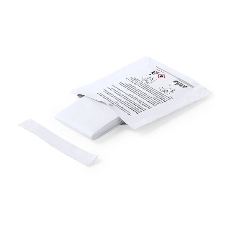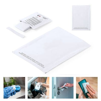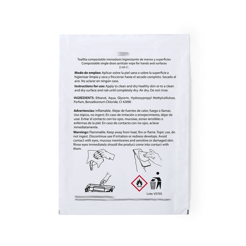 Chusteczka dezynfekcyjna z alkoholem, koperta 67 x 80 mm, chusteczka 165 x 155 mm, materiał kompostowalny, 70% alkoholu, do dezynfekcji rąk i powierzchni, ciekawy gadżet reklamowy, znakowanie - nadruk na kopercie