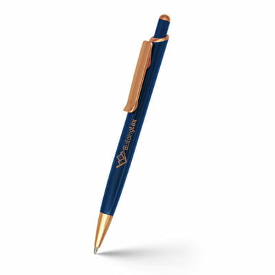Długopis aluminiowy, złote wykończenia, śr. 10 x 140 mm, niebieski wkład, znakowanie - laser - ukazuje złoty podkład, ciekawy gadżet reklamowy.