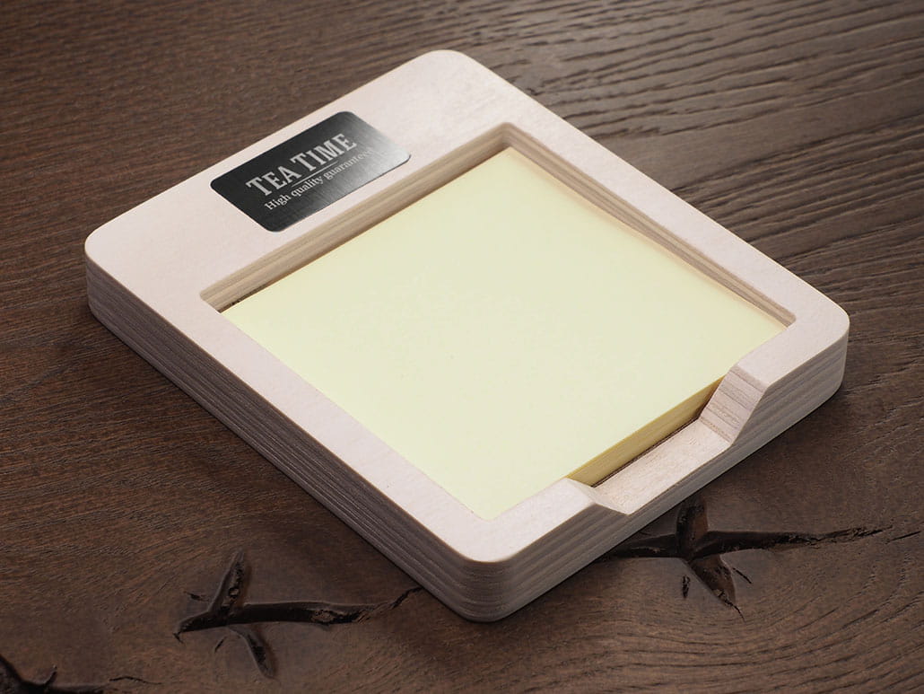 Drewniane pudełko na karteczki, sklejka brzozowa, wyściółka, 9 x 11 x 1,5 cm, 8 kolorów, blaszka, pudełko, produkcja na zamówienie, min. 50 szt., ciekawy gadżet reklamowy, znakowanie - laser