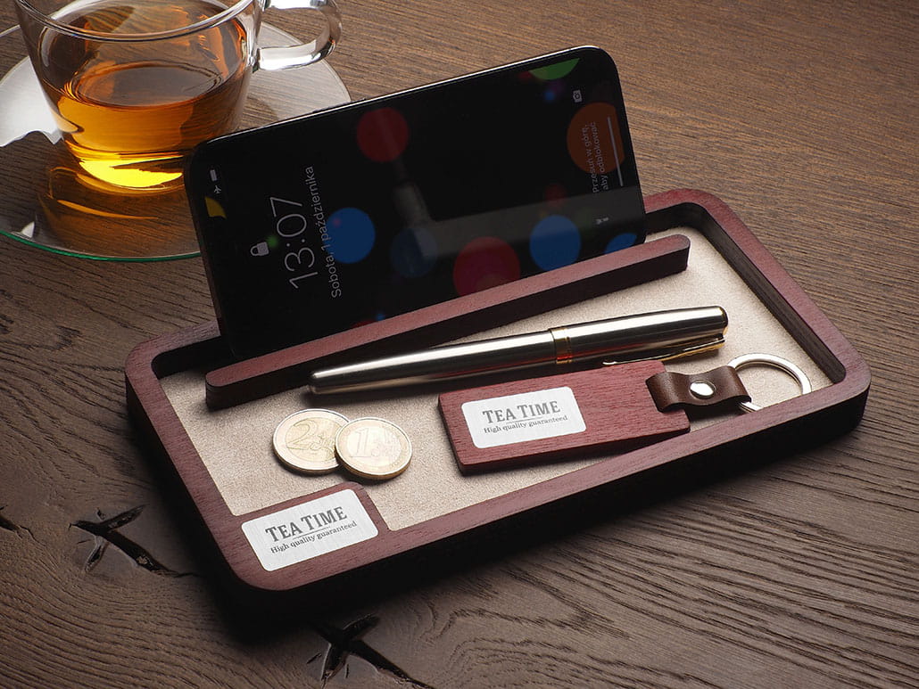 Drewniany organizer na biurko, sklejka brzozowa, 21 x 11 x 1,5 cm, min. 50 szt., wyściółka, blaszka pod grawer, pudełko, produkcja na zamówienie, 8 dostepnych kolorów, ciekawy gadżet reklamowy, znakowanie - laser, tłoczenie