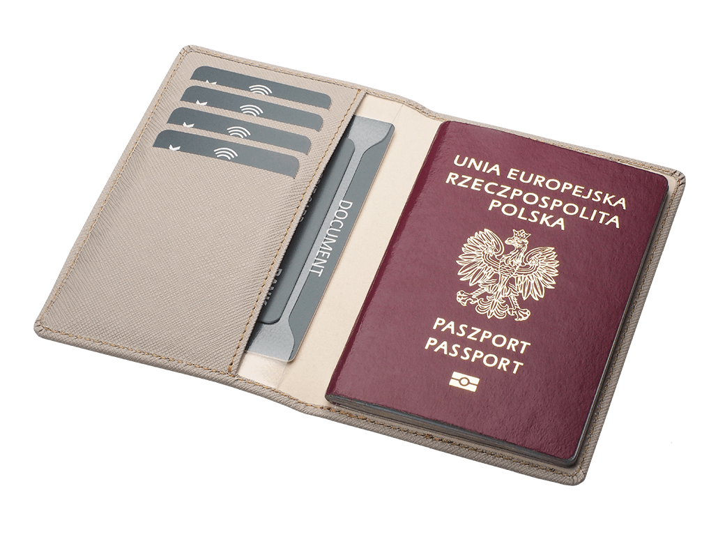 Etui na paszport RFID, ekoskóra, 10 x 14 cm, min. 50 szt., 3 kieszenie na dokumenty, 4 na karty kredytowe, kieszeń na paszport, pudełko, ciekawy gadżet reklamowy, znakowanie - laser, tłoczenie