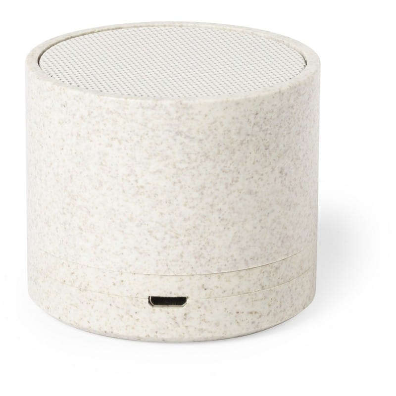 Głośnik reklamowy bezprzewodowy eko, słoma pszeniczna, ABS, śr. 74 x 45 mm, 3 W, 350 mAh, kabel micro USB, ciekawy gadżet reklamowy, znakowanie - nadruk