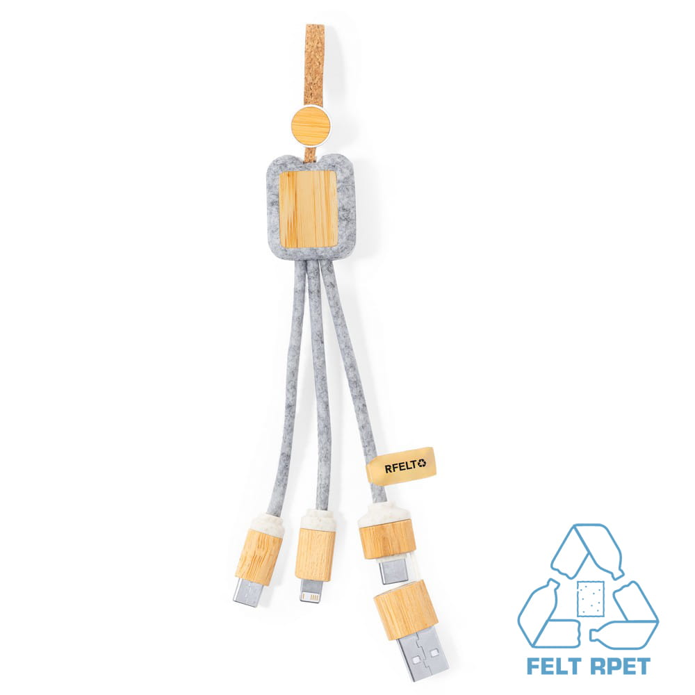 Kabel do ładowania - eko, bambus, filc RPET, 40 x 190 x 13 mm, końcówki USB, micro USB, typ C, dla iOS, ciekawy gadżet reklamowy, znakowanie - laser