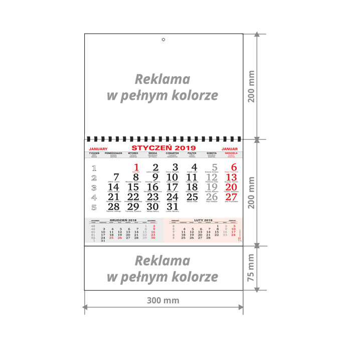 Kalendarz reklamowy jednodzielny mały ze stopką, 300 x 475 mm, spirala, sporo gotowych główek do wyboru, znakowanie - dowolny druk na stopce, cena dla 1000 szt. (od 50 szt. - 7,30). Możemy też zaprojektować swoją główkę. Tani i ciekawy upominek reklamowy