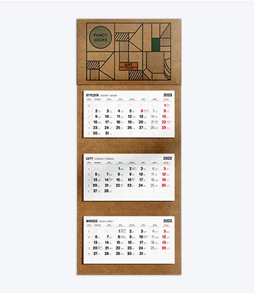 Kalendarz trójdzielny ekologiczny, główka wypukła, papier kraftliner 250g, 320 x 810 mm, druk w jednym lub 5 kolorach (biały podkład), cena na zapytanie, min. ilość - 50 szt.
