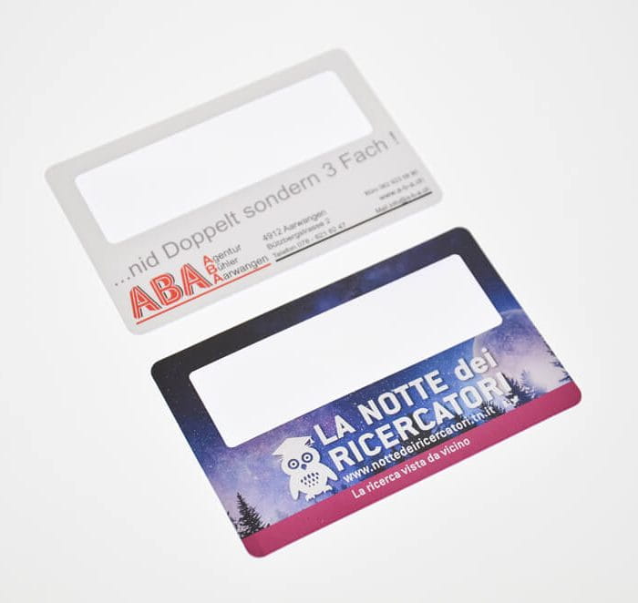Lupa - karta reklamowa, 85 x 55 mm, cena dla min. 100 szt., znakowanie -  dowolny druk UV, pakowana w woreczek, opcja etui papierowe z drukiem - 0,60, ciekawy gadżet reklamowy