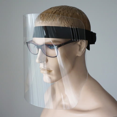 Przyłbica ochronna, antywirusowa, cena dla 10 szt., tworzywo PET 0,5 mm, rozmiar po rozłożeniu 350 x 240 mm, opaska gumowa z regulacją, czyszczenie środkami dezynfekującymi. Opcja z paskiem reklamowym z dowolnym drukiem, min. 20 szt. - 14,20
