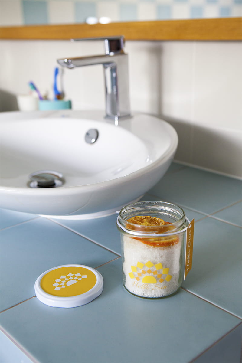 Sól reklamowa do kąpieli, słoik śr. 77 x 95 mm, kolor i zapach soli do wyboru - wanilia, kokos, piżmo, orchidea, drzewo kaszmirowe, bambus, świerk, poziomka, eukaliptus, mięta itp.,, pudełko, znakowanie - etykieta, bilecik, w pełnym kolorze