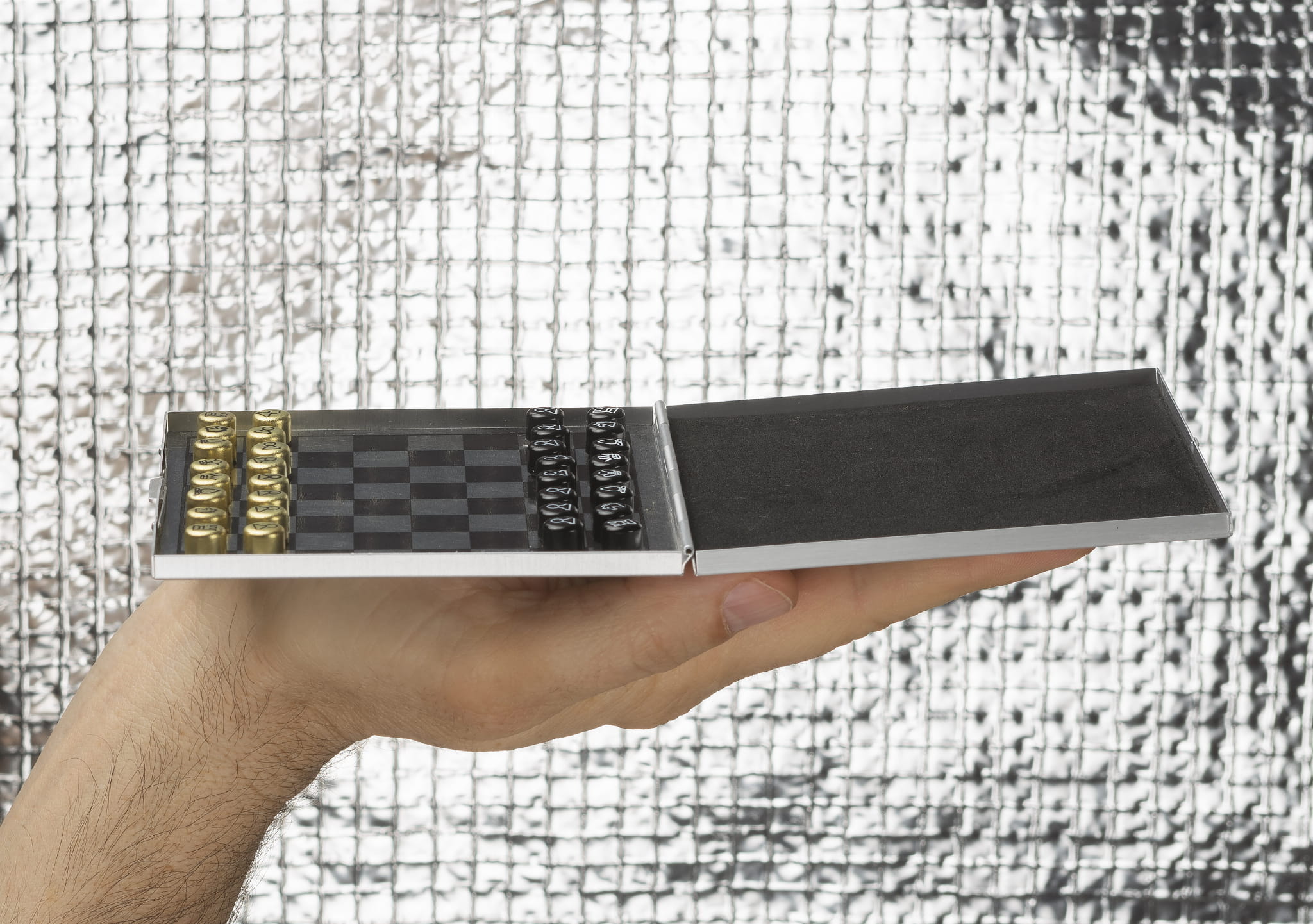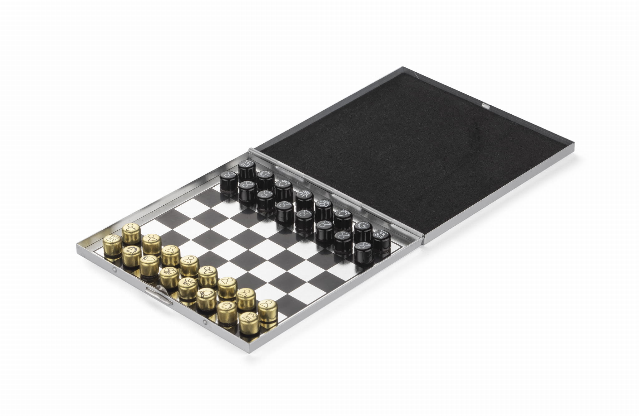 Szachy magnetyczne mini, 103 x 104 x 15 mm, aluminium, kartonik, ciekawy gadżet reklamowy, znakowanie - nadruk, laser