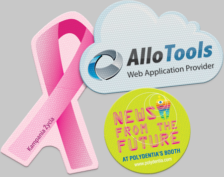 Telestoper - warstwa przyczepnego silikonu, folia z dowolnym nadrukiem, taśma samoprzylepna, na kartoniku - różne formy, woreczek foliowy. Cena dla rozmiaru 52 x 25 mm, dla 100 szt. Możliwy dowolny kształt - cena na zapytanie. Inne standardowe rozmiary: 36 x 36, 55 x 36, śr. 37 mm.