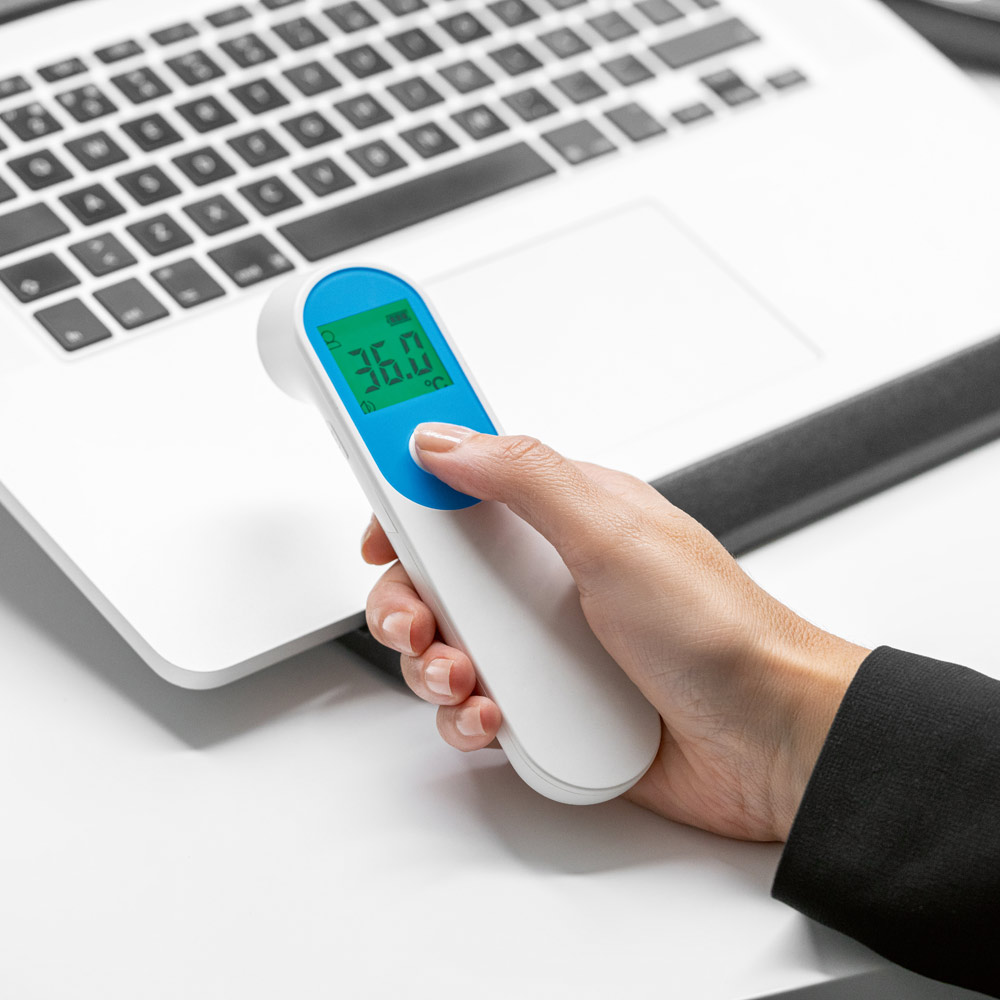 Termometr bezdotykowy na podczerwień, ABS, 38 x 160 x 38 mm, zawiera 2 bat. AAA, klasyfikacja - wyrób medyczny kl. IIa zgodnie z dyrektywą 93/42/EWG, pomiar ciała 32 - 43 stopnie i na powierzchni 5 - 95 st.C, pamięć 20 ostatnich pomiarów, sygnał dźwiękowy zakończenia pomiaru, ciekawy gadżet reklamowy, znakowanie - nadruk