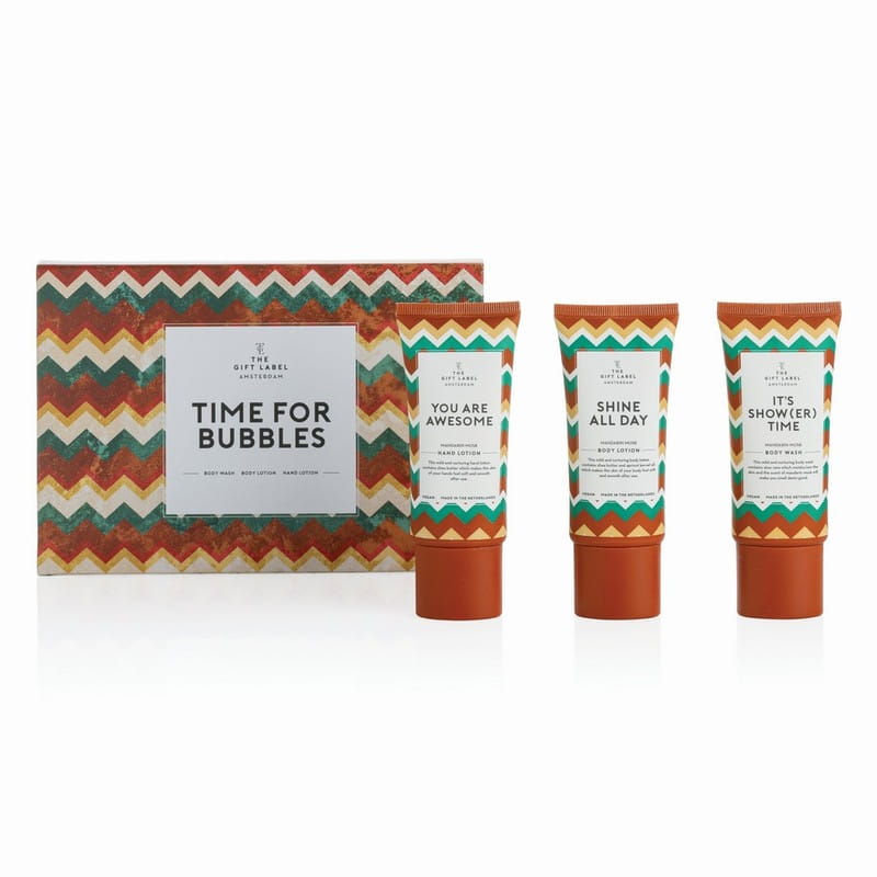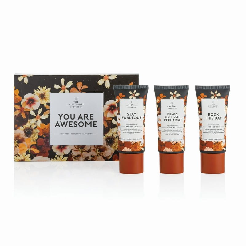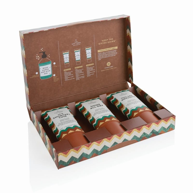 Zestaw kosmetyków wege, 215 x 140 x 25 mm, z trzciny cukrowej, zapach mandarynki i piżma, po 50 ml, krem do rąk, żel pod prysznic, balsam do ciała, ciekawy upominek reklamowy