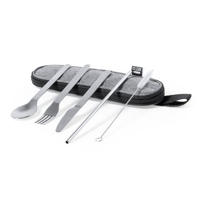 Zestaw sztućców 5 el., stal nierdzewna, 75 x 245 x 20 mm, łyżka, nóż, widelec, słomka, czyścik, ciekawy gadżet reklamowy, znakowanie - nadruk, laser